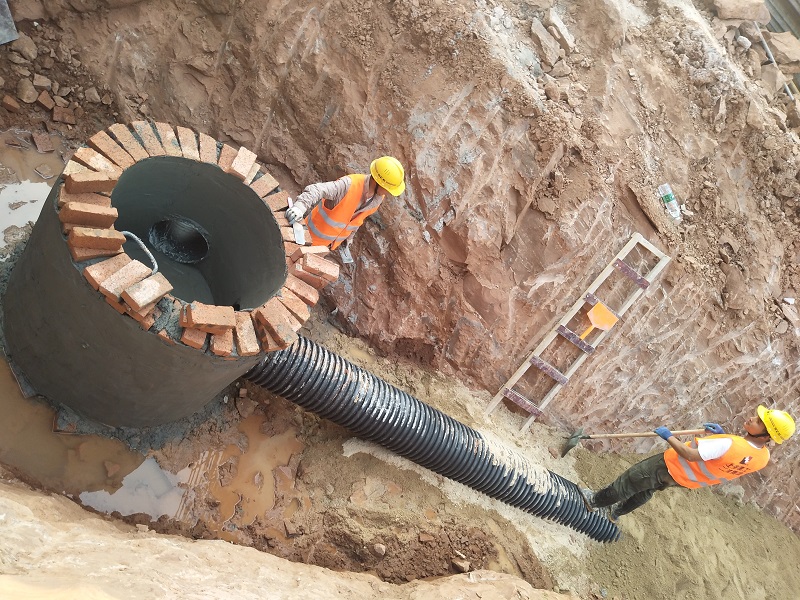 公司承接了百聯(lián)購(gòu)物公園的小市政項(xiàng)目,項(xiàng)目主要由DN300球墨鑄鐵給水管道、DN600HDPE雙壁波紋雨水管道、DN400雙壁波紋污水管道、DN100PE中水管道及各種閥門(mén)井及檢查井組成,管道設(shè)計(jì)結(jié)構(gòu)錯(cuò)綜復(fù)雜、排列緊密,污水管道設(shè)計(jì)埋深甚至達(dá)到4~5米,整個(gè)項(xiàng)目又均為風(fēng)化巖地貌,施工難度很大。加之工期正值端午前后,雨水充沛,大量暴雨也為施工帶來(lái)了不小的難度。施工期間,先后遇到了如管道作業(yè)面狹小四排管道施工無(wú)法同時(shí)推進(jìn)、井面設(shè)計(jì)標(biāo)高與園林地面標(biāo)高無(wú)法統(tǒng)一、深基坑土方開(kāi)挖及支護(hù)、甲方開(kāi)業(yè)搶進(jìn)度等一系列問(wèn)題。但是,在我們星澤公司項(xiàng)目部全體同仁的共同努力下,以發(fā)揚(yáng)不怕苦、不怕累的艱苦奮斗的精神,本著客戶第一、質(zhì)量第一的理念,在保證安全和工期的前期下,順利完成施工任務(wù),項(xiàng)目也得到了業(yè)主及總包的充分肯定。