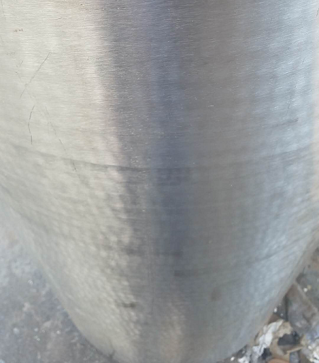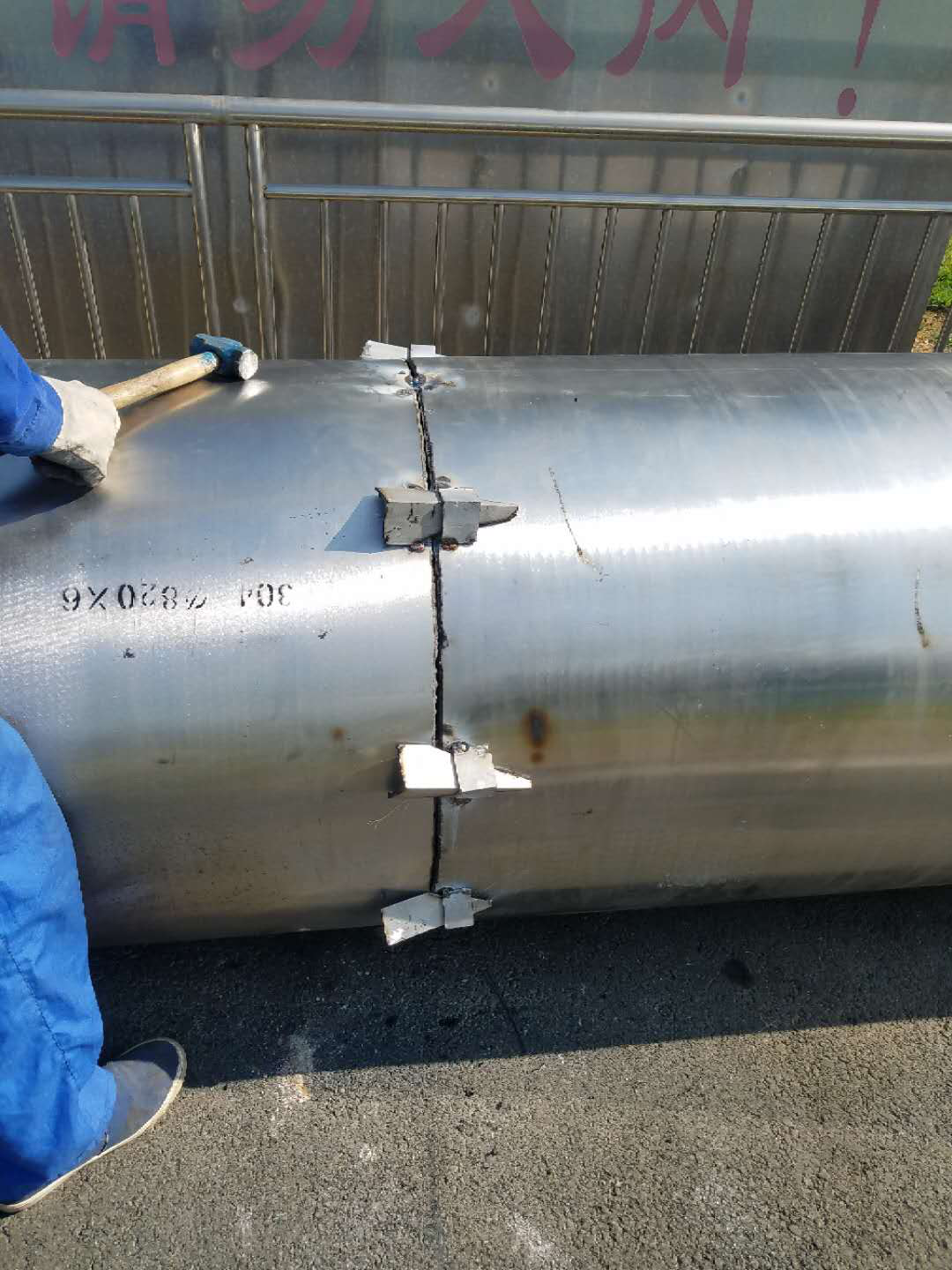 煙囪主管焊接好后對焊口用不銹鋼酸洗膏進行酸洗鈍化處理,由于不銹鋼酸洗膏的主要是硝酸、硫酸、磷酸、氫氟酸等多種酸的混合物作為腐蝕氧化層的主要成分,能夠去掉焊口焊渣的黑色物質(zhì),讓焊口光亮如新,且在焊口位置根據(jù)不銹鋼的抗腐蝕陛性能能發(fā)生鈍化反應,形成一層極薄的(約1nm)致密的保護膜保護焊口,使得焊口更美觀并提高耐腐蝕性能