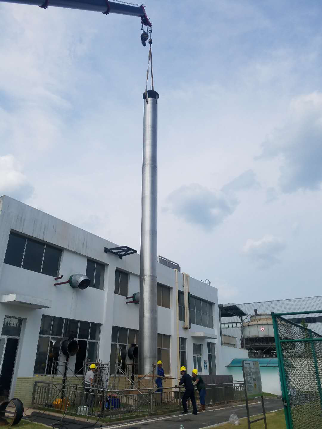 拆除完畢后,對原有基礎進行處理,處理好后對新不銹鋼主煙囪吊裝就位調(diào)直