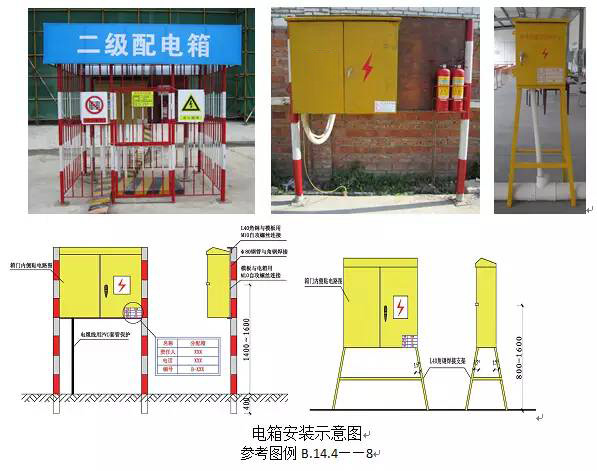 3、配電箱、開(kāi)關(guān)箱應(yīng)裝設(shè)端正、牢固;固定式配電箱、開(kāi)關(guān)箱的中心點(diǎn)與地面的垂直距離應(yīng)為1.4~1.6m;移動(dòng)式配電箱、開(kāi)關(guān)箱應(yīng)裝設(shè)在堅(jiān)固的支架上,其中心點(diǎn)與地面的垂直距離宜為0.8~1.6m。(JGJ46-2005第8.1.8條)